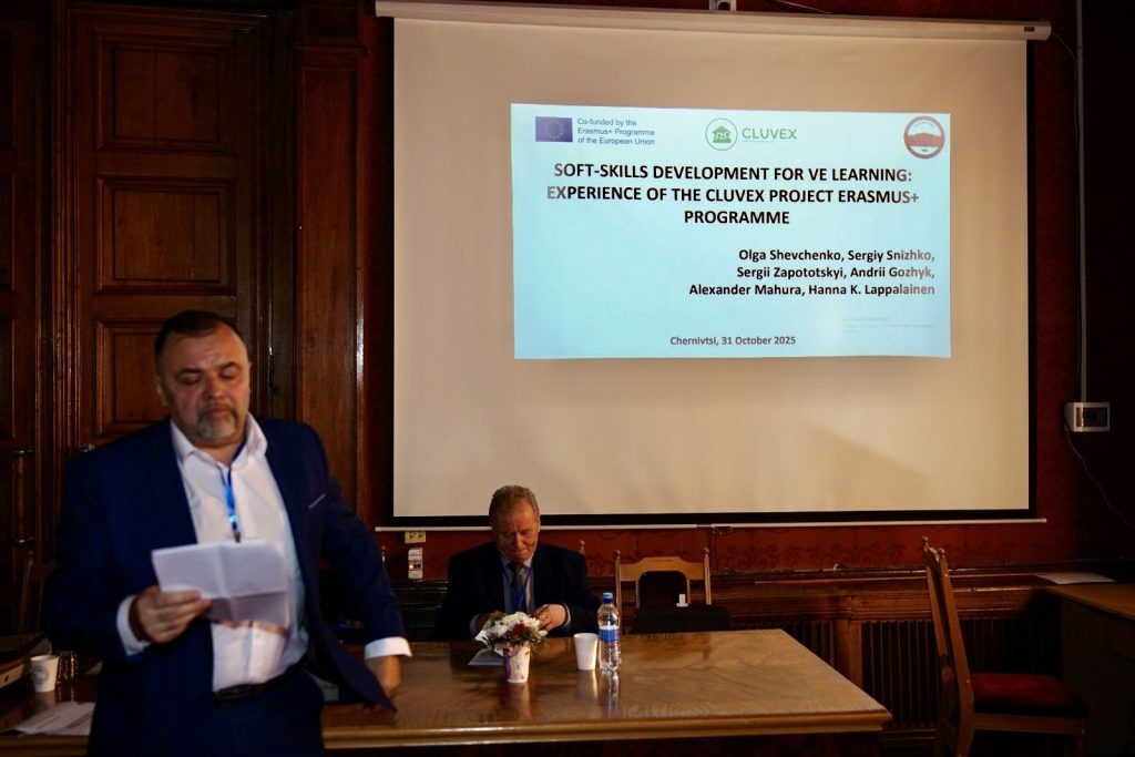 On October 31, 2025, Prof. Sergii Zapototskyi, Dean of the Geography Faculty of TSNUK, presented the experience of the CLUVEX project and gave a presentation entitled “DEVELOPMENT OF SOFT SKILLS FOR VIRTUAL LEARNING: THE EXPERIENCE OF THE CLUVEX PROJECT OF THE ERASMUS+ PROGRAM” at the International Scientific and Practical Conference “Geography, Cartography, and Geographic Education: History, Methodology, Practice” at Yurii Fedkovych Chernivtsi National University, Chernivtsi, Ukraine (https://www.chnu.edu.ua/).