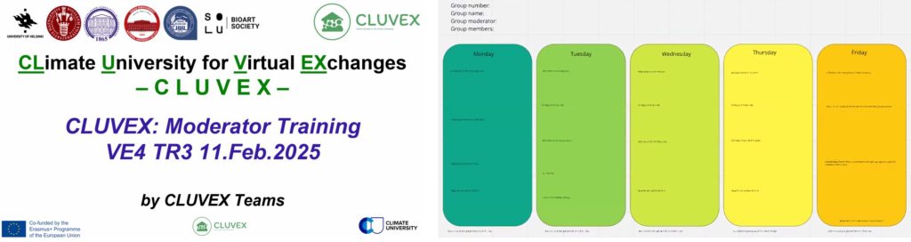 The VE Week programme (day-by-day) schedule was repeated for the moderators. The capabilities of the Miro-board for the groups of students were also demonstrated and recommended to “play” (how to add information to the board, how to use sticky notes, how to draw, how to use all available options on the board). The participants of the training answered on questionnaire “Moderators basic information and expectations” related questions on motivation, proficiency with technology, expectations about social interaction, challenges and feedback. Then, the moderators got into break-out-rooms for practicing on get-to-know activity. Finally, the credits for moderators were explained in more details. All these activities were followed by questions from the participants and answers from the CLUVEX University Helsinki team members.