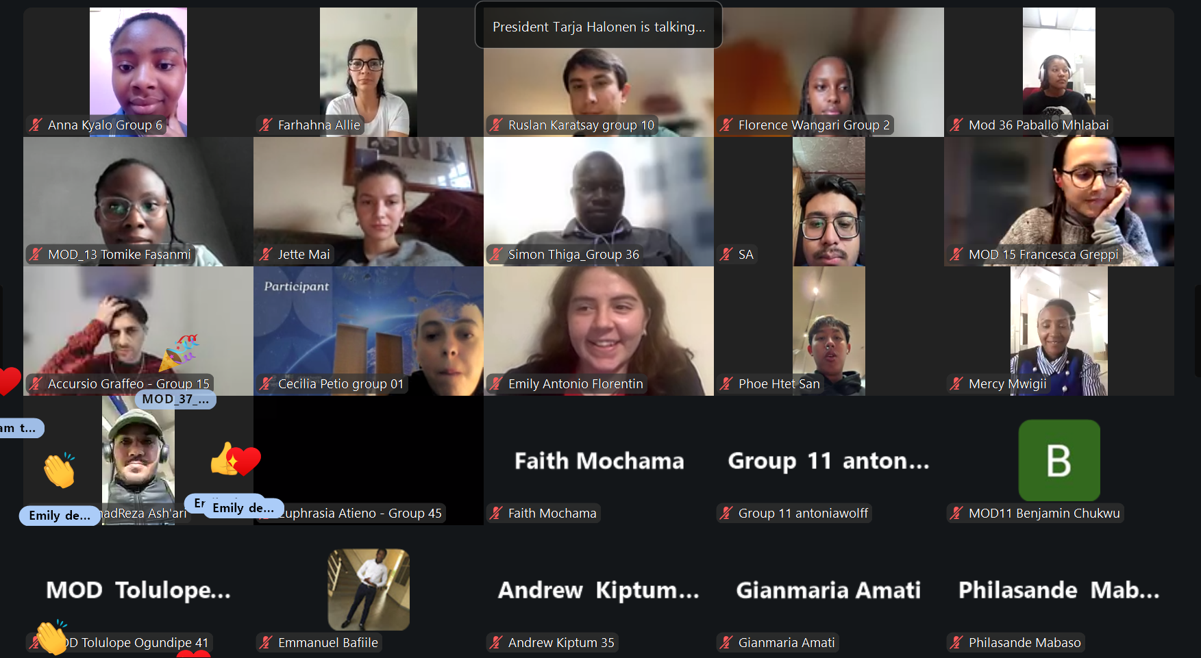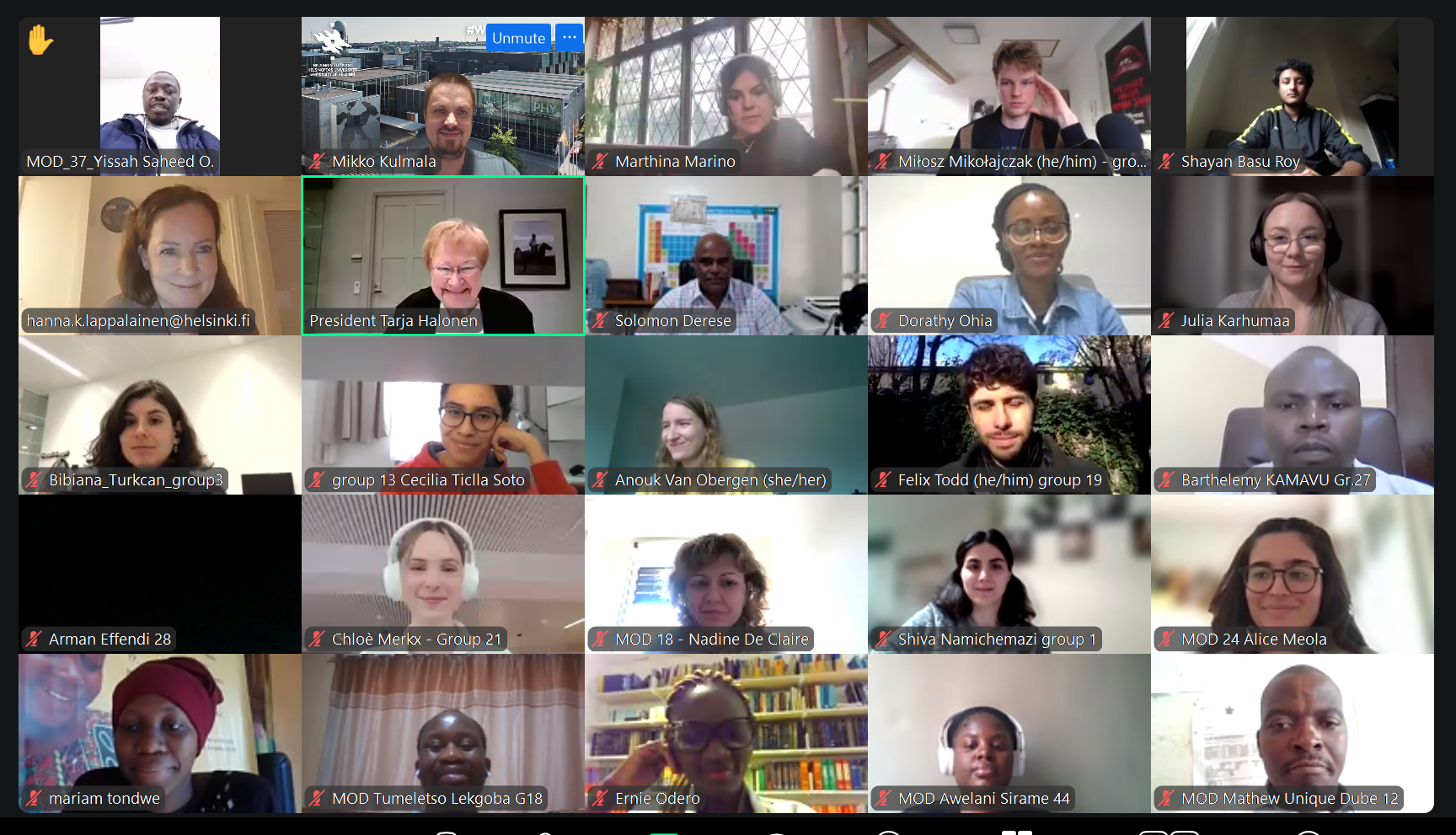 During this session, the students enjoyed another interesting guest lecture before continuing their work on the sustainability action task. The guest speech was given by President Tarja Halonen, former president of Finland, on Sustainable Development in Politics. After this presentation there was time for a Q&A session with the former President. For the last two hours, students had time to continue working on their sustainability action task. With the help of moderators they had group discussions on how the sustainability action task was going and how the guest lecture influenced their opinion.