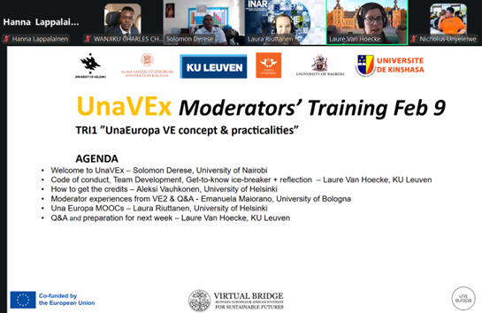 Topics included UnaVEx vision and concept, soft skills and groupwork, the Digicampus learning platform, moderator experiences, micro-credentials in sustainability, and preparation for the next session.